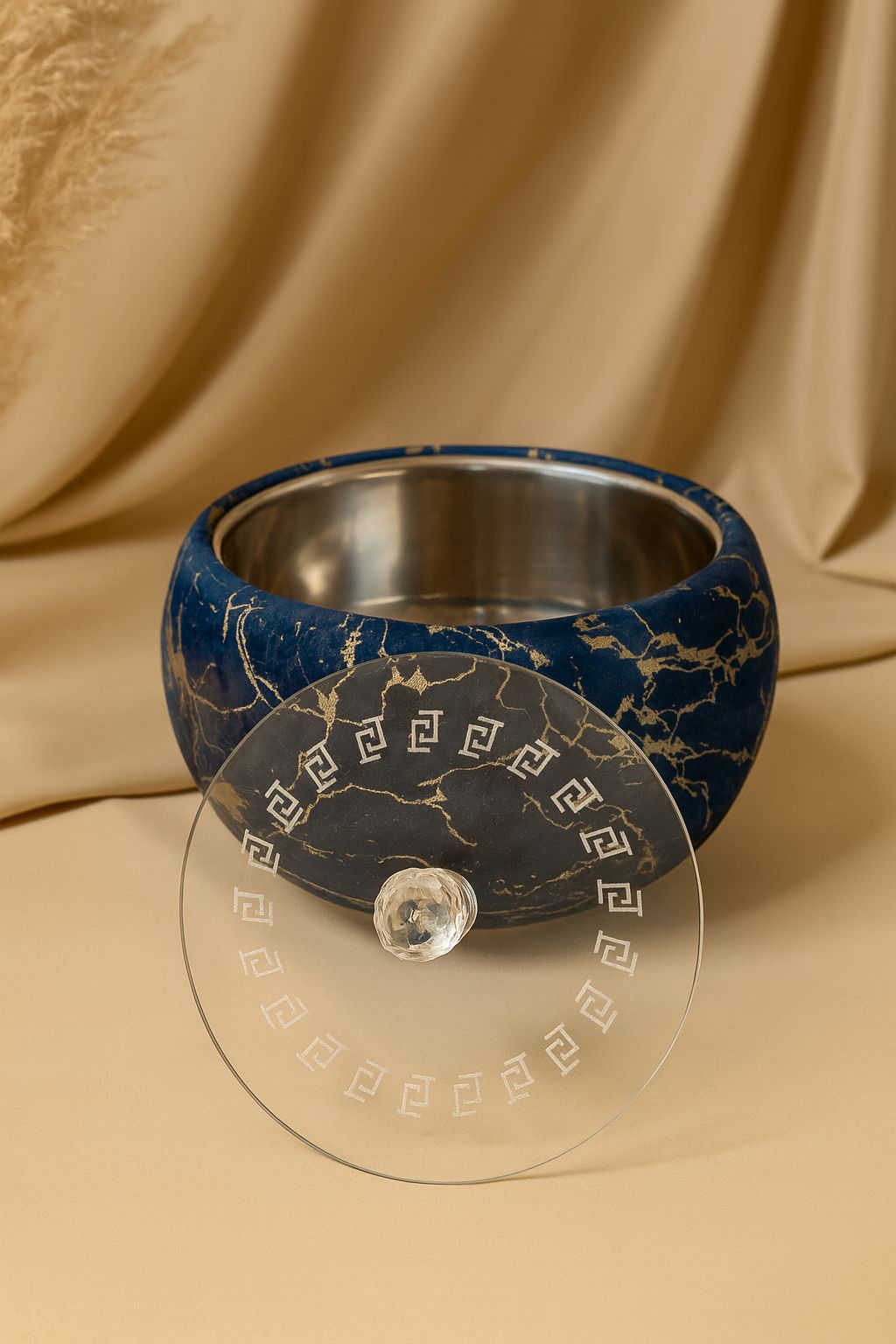 Designed with a rich teal finish and highlighted by striking gold marbled accents, this statement piece instantly elevates any room. The lid, topped with a sparkling crystal-style knob, adds a sophisticated touch while keeping the contents secure and beautifully concealed.